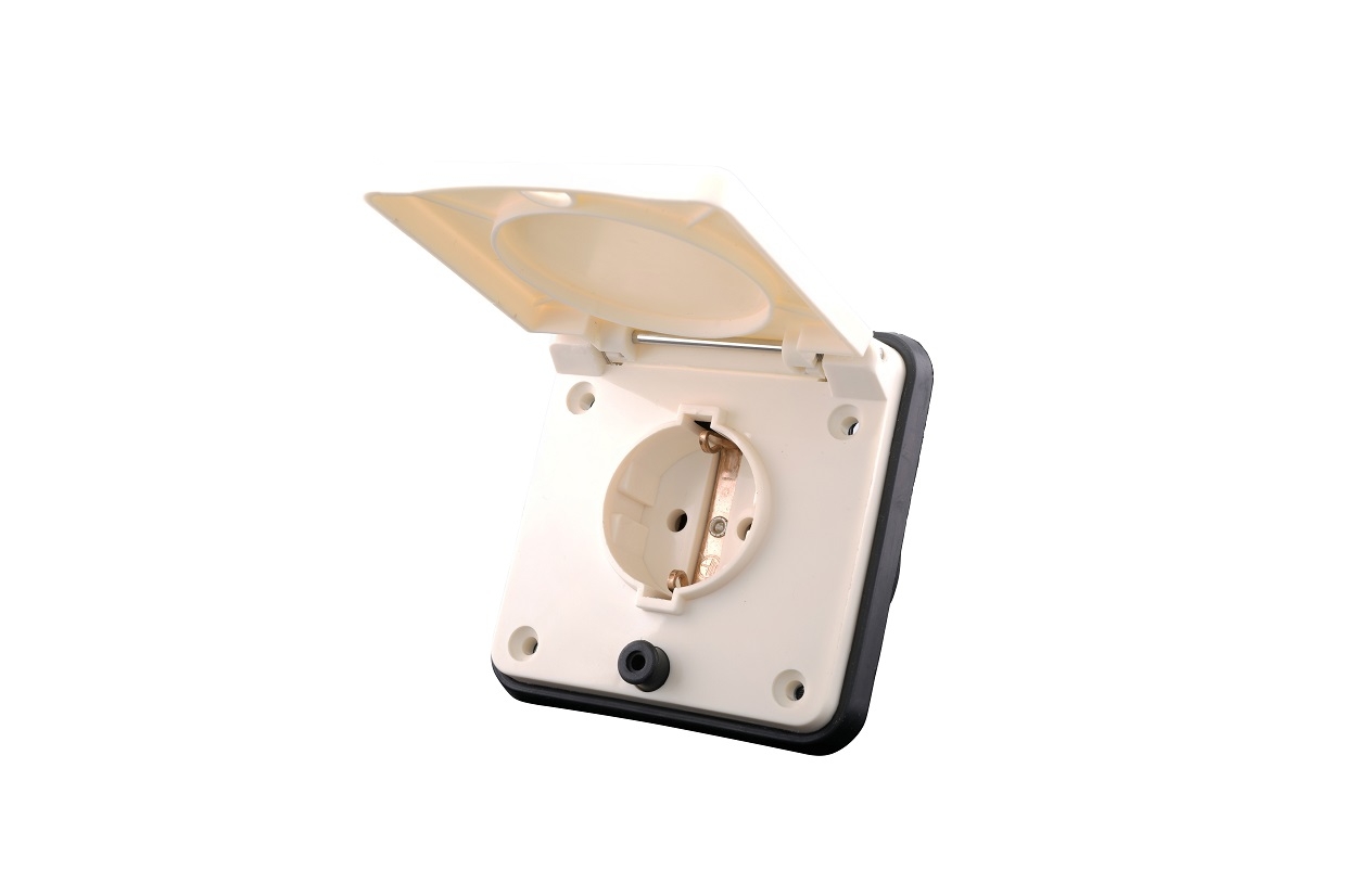 Upotettava kannellinen 1.os schuko pistorasia vaunun tai auton ulkoseinään.